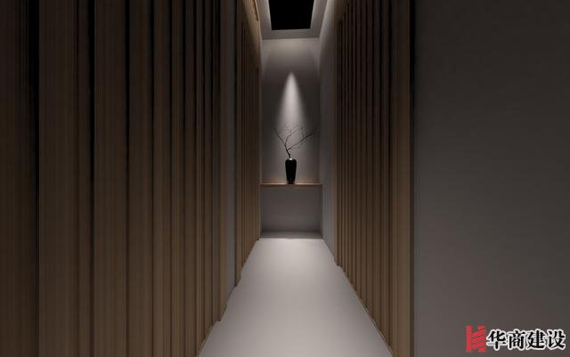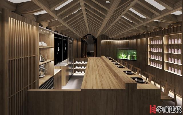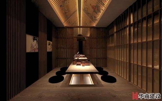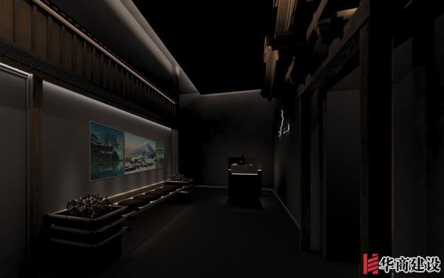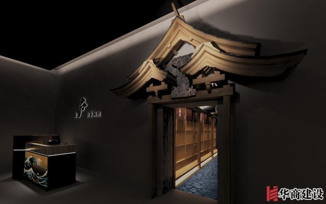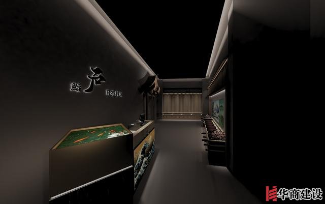 本案在設計中利用該店狹長的特點將日本建筑理念融入餐廳空間設計,創(chuàng)作出日本胡同的延伸感。整體設計以日本原生文化為基調(diào),在空間裝飾上以木制材料為主,配以青石、屋檐、壁畫、雕塑營造出濃郁日本文化和古樸自然之美。而屋脊端頭鬼瓦的裝飾看似不經(jīng)意,卻最能襯托出日式“精致”之感,在餐廳入口處設置流動氣息的水池,代表著靜中有動的生命力,與整體沉穩(wěn)內(nèi)斂的基調(diào)形成對比。