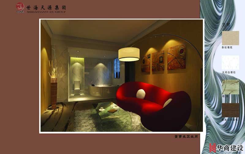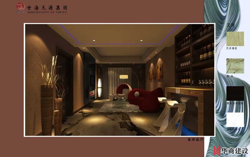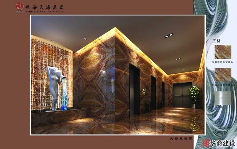 結合空間的藝術特點,設計師特別注重了材質(zhì)的搭配和對比,光滑與粗糙、黑與白,相互的撞擊著,強化了空間的質(zhì)感,并豐富著視覺的層次。大堂以紋路豐富的路易斯金為主材,光潔明亮的墻面和天然粗礪的服務臺形成強烈的對比,營造出自然、淳樸、溫暖的氛圍,獨具匠心的大堂吊燈,充滿了童心稚趣,也有大珠小珠落玉盤之勢,非常引人注目。除此之外,在軟裝和家私擺設上也經(jīng)過深思熟慮的考究,在進入電梯間的入口處的藝術水景更是增添了更多的藝術成分,創(chuàng)造出優(yōu)雅、閑適的氣質(zhì)??头靠臻g以大花白石材、黑鏡鋼和黑玻及藝術墻紙為主材,把空間營造出層次豐富、質(zhì)感十足。