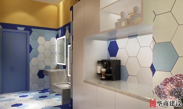 茶水間的設計,墻面、地面背景主要采用的是藍色和白色相結(jié)合,相得益彰