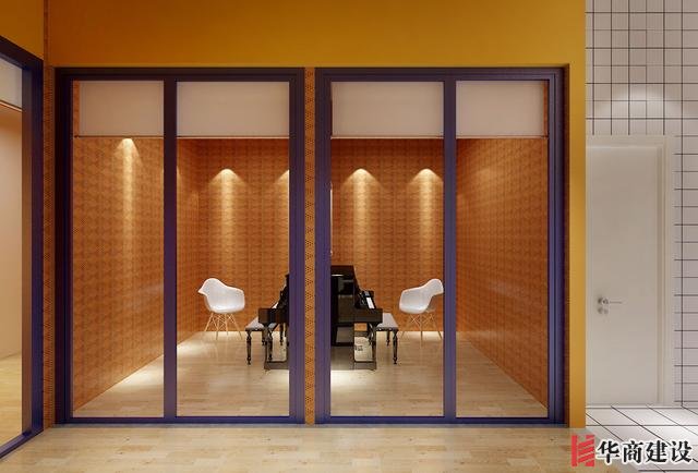 音樂教室的設計,全透明的玻璃門,柔和的燈光設計,營造出一種濃厚的藝術氛圍