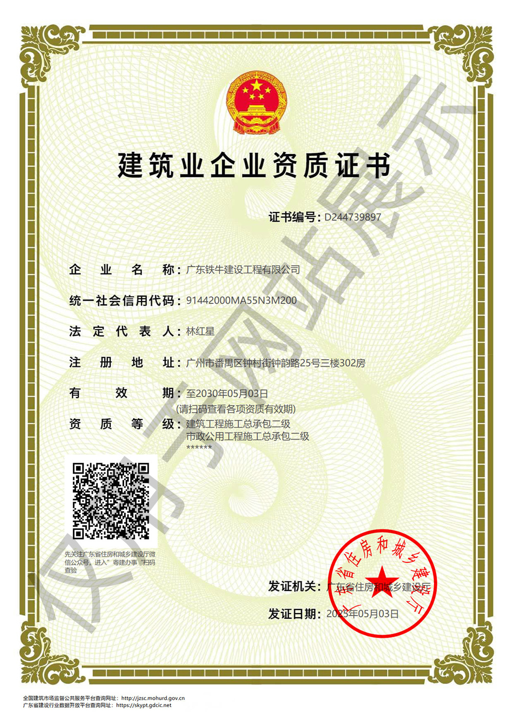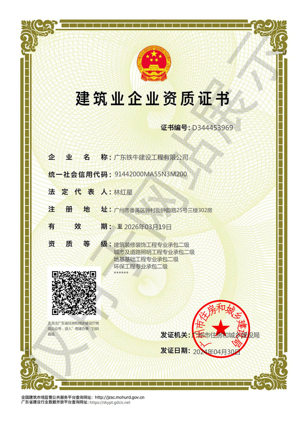 公司現(xiàn)具有國家住建部頒發(fā)的多項(xiàng)資質(zhì)。建筑工程施工總承包、建筑裝修裝飾工程專業(yè)承包、市政公用工程施工總承包、地基基礎(chǔ)工程專業(yè)承包、環(huán)保工程專業(yè)承包、城市及道路照明工程專業(yè)承包等,并且公司建立了科學(xué)完善、運(yùn)轉(zhuǎn)高效的管理體制,各專業(yè)技術(shù)力量配套齊全。