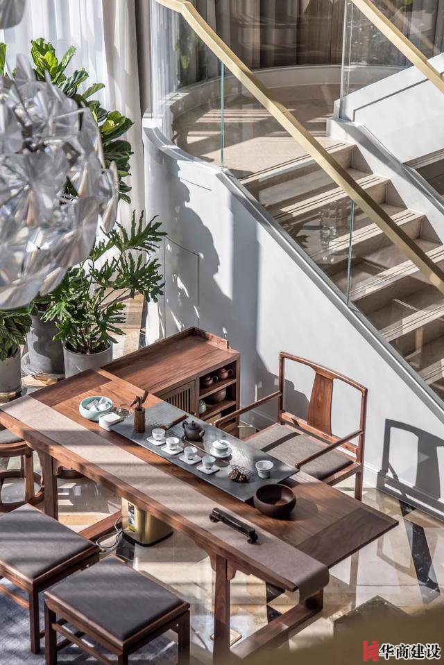 設(shè)計師使空間的光感透徹,陽光透過重重疊疊的枝蔓印在樓梯玻璃之上,光影被分割投射在新中式風(fēng)格的桌椅上,木色調(diào)隨即變得深淺不一,給人茗香未起,雅意四圍的空間感受。