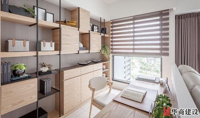 書房打通之后變成開放式的格局,墻面定制了一整面墻的鐵藝實木書柜,造型很漂亮,收納起來也很實用。安裝木質(zhì)卷簾,可以適當(dāng)調(diào)節(jié)書房的光線,而且整個書房的顏值都高了不少。
