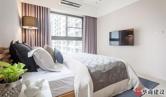 主臥的色彩配置和客廳保持一致,沒有做復(fù)雜的吊頂,墻面刷成,搭配灰白的床品布藝,整個空間給人一種輕松的舒適感。