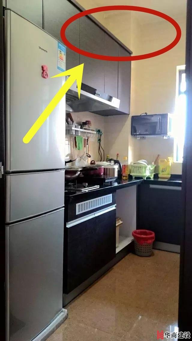 3、櫥柜上頭沒做到頂,導(dǎo)致空出一大片空白地方,打掃的時候又是搬梯子又是洗抹布真的心累!要是不去打掃,上面就是蟑螂的基地!光看著都覺得頭疼!