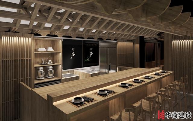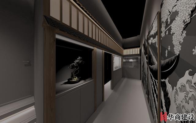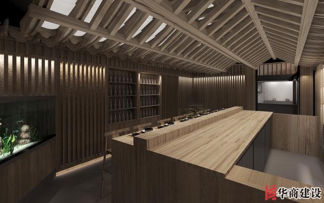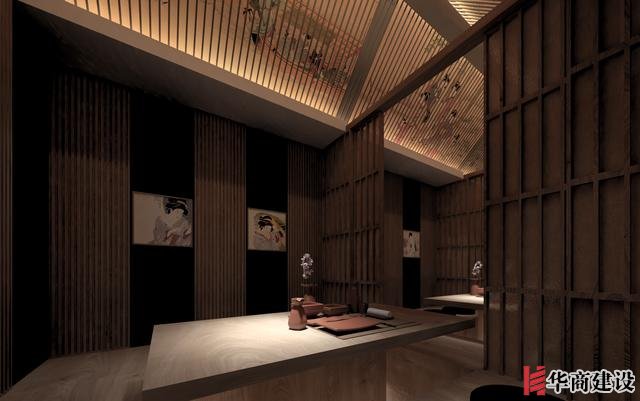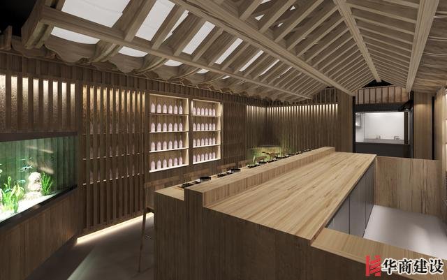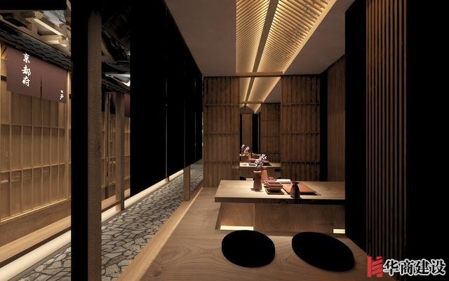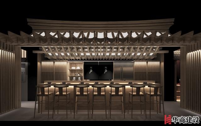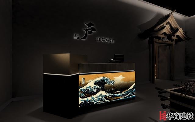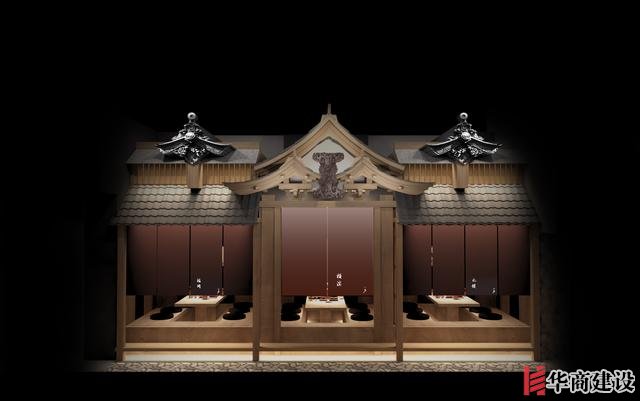 本案在設計中利用該店狹長的特點將日本建筑理念融入餐廳空間設計,創(chuàng)作出日本胡同的延伸感。整體設計以日本原生文化為基調(diào),在空間裝飾上以木制材料為主,配以青石、屋檐、壁畫、雕塑營造出濃郁日本文化和古樸自然之美。而屋脊端頭鬼瓦的裝飾看似不經(jīng)意,卻最能襯托出日式“精致”之感,在餐廳入口處設置流動氣息的水池,代表著靜中有動的生命力,與整體沉穩(wěn)內(nèi)斂的基調(diào)形成對比。