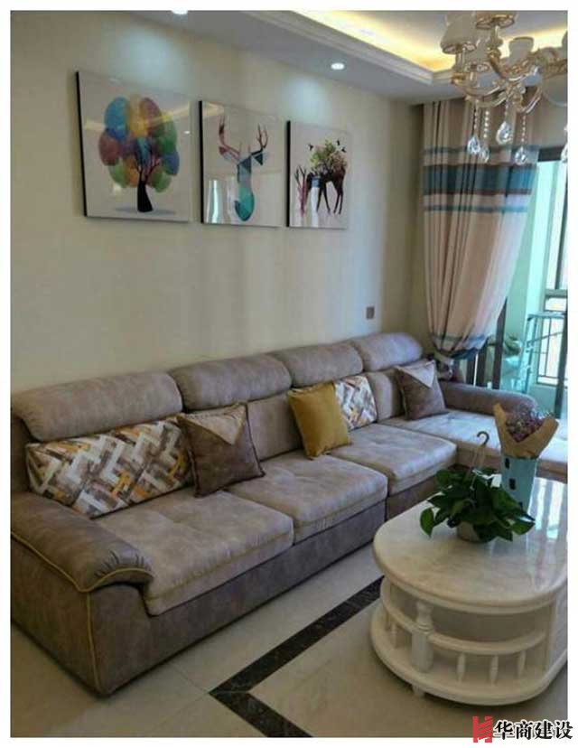 深色的布沙發(fā),墻壁后面掛了三幅畫,不顯得太空。