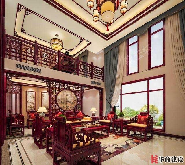 現(xiàn)代中式客廳裝修效果圖,提空的設(shè)計提升了客廳的格局氣度,兩層設(shè)計更顯大氣華美,客廳中紅木桌椅的富貴精美與中堂畫的素雅淡邈相映成趣,更加深化了中式的氣質(zhì)。