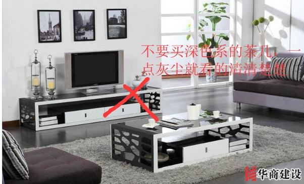 2、客廳的電視柜和茶幾,不要買深色系的,一點灰塵看的清清楚楚,后期可有你忙的。