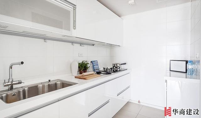 進門的右手邊門進去就是廚房,也就是餐廳和玄關(guān)包圍在里面的空間,沒有窗戶,整體櫥柜和瓷磚都選的白色的,屋里也看著亮堂多了。