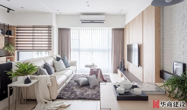 客廳就在餐廳一側(cè),沒有陽臺,大大的落地窗光線比較好,米色的真皮沙發(fā),原木硬包的電視柜,簡約大氣,視覺感很舒適。沙發(fā)背景墻就是和書房之間的隔墻,原本的墻面直接拆掉了,沙發(fā)背景墻變成了書桌的背板,節(jié)省空間,這樣兩個空間的光線都相互融合,很敞亮。