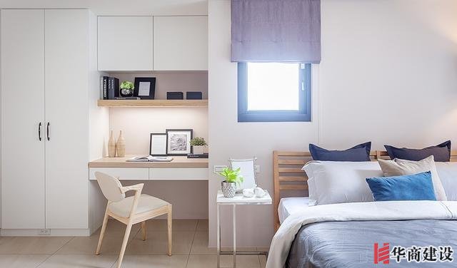 兒童房比較小,床和主臥一樣都是原木床,衣柜側(cè)面留出來一個書桌的空間,書柜和懸掛式的簡易書桌,一個小小的寫字臺也有了,功能更齊全。